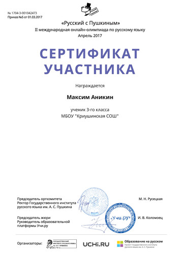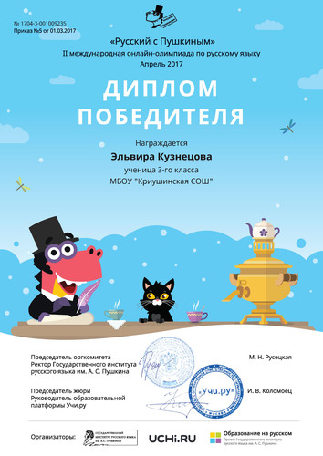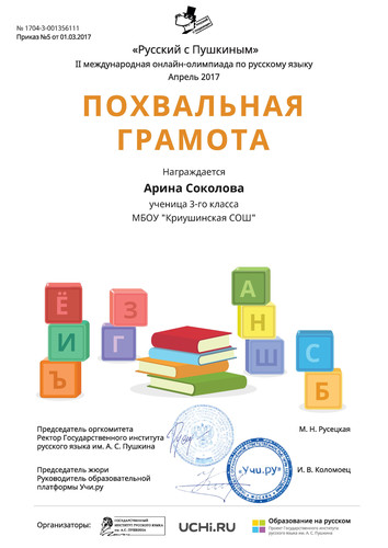 19 апреля 2017 года закончилась Международная онлайн-олимпиада по русскому языку для учеников 1-4 классов "Русский с Пушкиным". Олимпиада прошла в необычном формате, все задания были представлены в интерактивной, игровой форме! Задания олимпиады охватывали такие аспекты курса русского языка в начальной школе, как алфавит, соотношение звуков и букв, членение текста на слоги, орфография и пунктуация, лексика и фразеология, логика построения текста. Основная цель олимпиады - популяризация лингвистических знаний и повышение интереса учащихся к родному языку.
